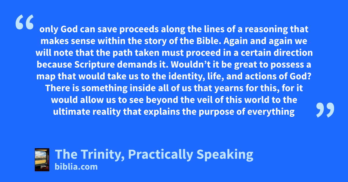 only God can save proceeds along the lines of a reasoning that makes sense within the story of the Bible. Again and again we will note that the path taken must proceed in a certain direction because Scripture demands it. Wouldn’t it be great to possess a map that would take us to the identity, life, and actions of God? There is something inside all of us that yearns for this, for it would allow us to see beyond the veil of this world to the ultimate reality that explains the purpose of everything