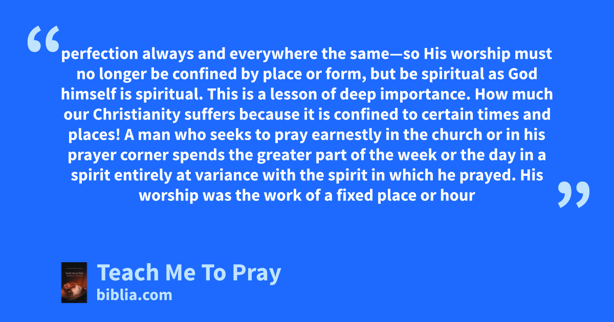 perfection always and everywhere the same—so His worship must no longer be confined by place or form, but be spiritual as God himself is spiritual. This is a lesson of deep importance. How much our Christianity suffers because it is confined to certain times and places! A man who seeks to pray earnestly in the church or in his prayer corner spends the greater part of the week or the day in a spirit entirely at variance with the spirit in which he prayed. His worship was the work of a fixed place or hour