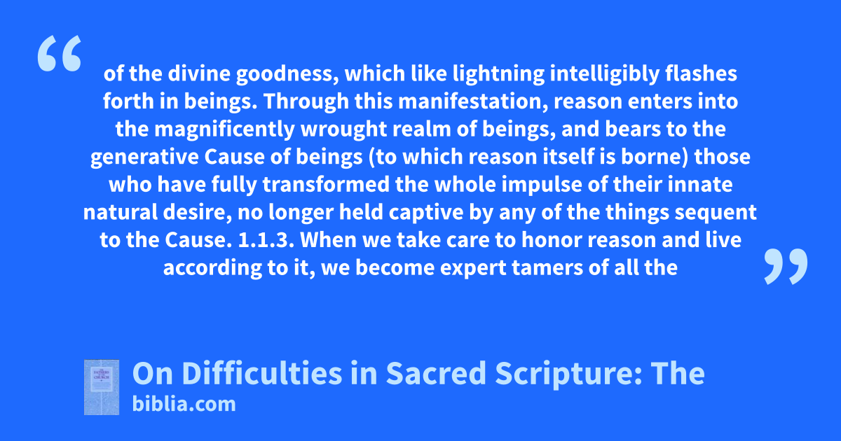 of the divine goodness, which like lightning intelligibly flashes forth in beings. Through this manifestation, reason enters into the magnificently wrought realm of beings, and bears to the generative Cause of beings (to which reason itself is borne) those who have fully transformed the whole impulse of their innate natural desire, no longer held captive by any of the things sequent to the Cause. 1.1.3. When we take care to honor reason and live according to it, we become expert tamers of all the