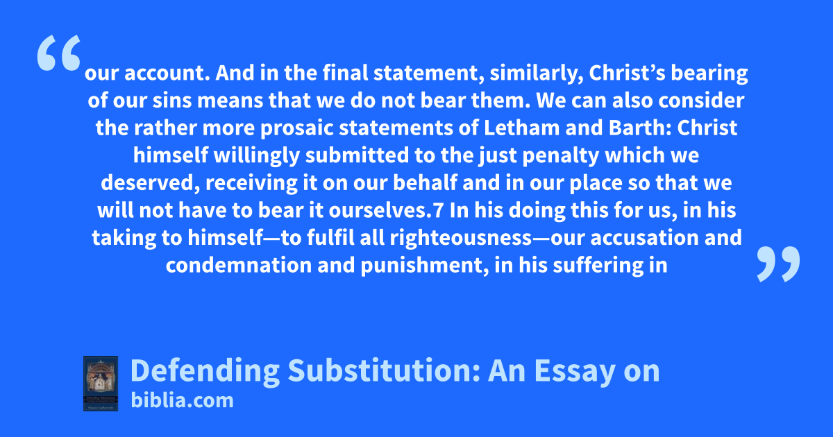 our account. And in the final statement, similarly, Christ’s bearing of our sins means that we do not bear them. We can also consider the rather more prosaic statements of Letham and Barth: Christ himself willingly submitted to the just penalty which we deserved, receiving it on our behalf and in our place so that we will not have to bear it ourselves.7 In his doing this for us, in his taking to himself—to fulfil all righteousness—our accusation and condemnation and punishment, in his suffering in