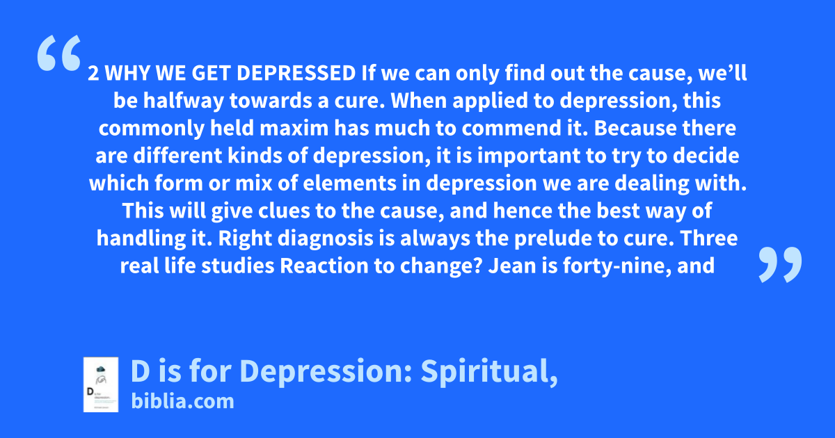 2 WHY WE GET DEPRESSED If we can only find out the cause, we’ll be halfway towards a cure. When applied to depression, this commonly held maxim has much to commend it. Because there are different kinds of depression, it is important to try to decide which form or mix of elements in depression we are dealing with. This will give clues to the cause, and hence the best way of handling it. Right diagnosis is always the prelude to cure. Three real life studies Reaction to change? Jean is forty-nine, and