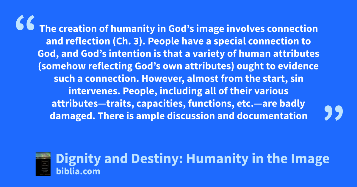 The creation of humanity in God’s image involves connection and reflection (Ch. 3). People have a special connection to God, and God’s intention is that a variety of human attributes (somehow reflecting God’s own attributes) ought to evidence such a connection. However, almost from the start, sin intervenes. People, including all of their various attributes—traits, capacities, functions, etc.—are badly damaged. There is ample discussion and documentation