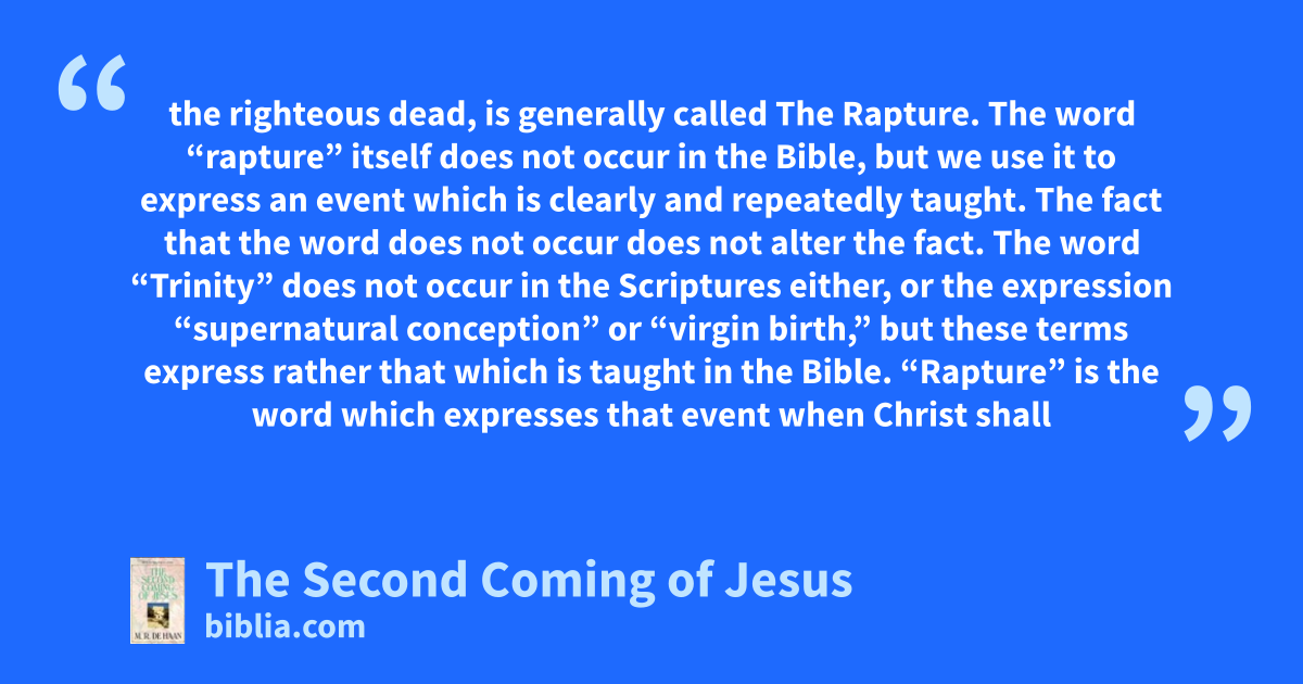 the righteous dead, is generally called The Rapture. The word “rapture” itself does not occur in the Bible, but we use it to express an event which is clearly and repeatedly taught. The fact that the word does not occur does not alter the fact. The word “Trinity” does not occur in the Scriptures either, or the expression “supernatural conception” or “virgin birth,” but these terms express rather that which is taught in the Bible. “Rapture” is the word which expresses that event when Christ shall