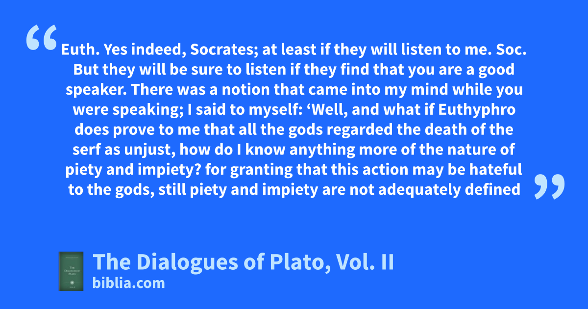 Euth. Yes indeed, Socrates; at least if they will listen to me. Soc. But they will be sure to listen if they find that you are a good speaker. There was a notion that came into my mind while you were speaking; I said to myself: ‘Well, and what if Euthyphro does prove to me that all the gods regarded the death of the serf as unjust, how do I know anything more of the nature of piety and impiety? for granting that this action may be hateful to the gods, still piety and impiety are not adequately defined