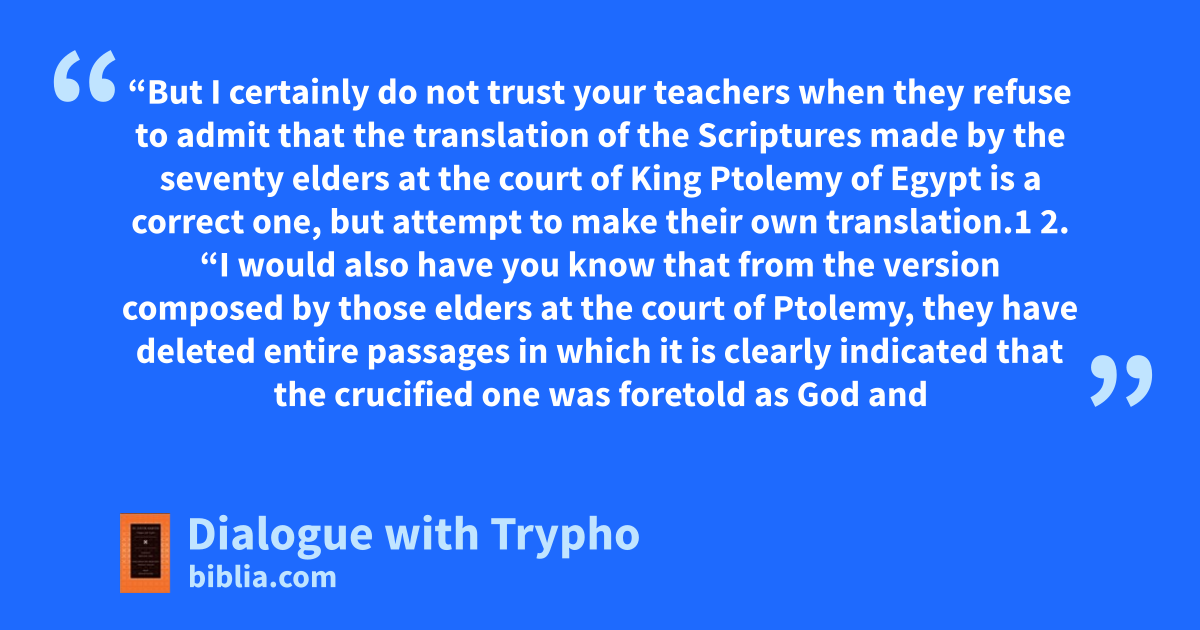 “But I certainly do not trust your teachers when they refuse to admit that the translation of the Scriptures made by the seventy elders at the court of King Ptolemy of Egypt is a correct one, but attempt to make their own translation.1 2. “I would also have you know that from the version composed by those elders at the court of Ptolemy, they have deleted entire passages in which it is clearly indicated that the crucified one was foretold as God and