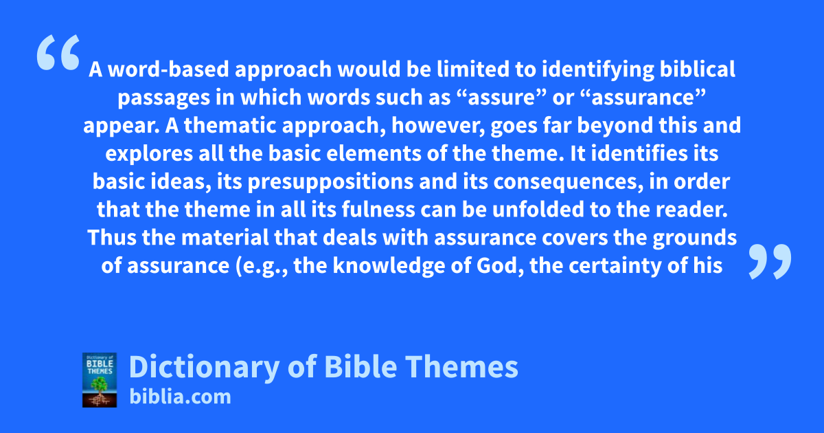 A word-based approach would be limited to identifying biblical passages in which words such as “assure” or “assurance” appear. A thematic approach, however, goes far beyond this and explores all the basic elements of the theme. It identifies its basic ideas, its presuppositions and its consequences, in order that the theme in all its fulness can be unfolded to the reader. Thus the material that deals with assurance covers the grounds of assurance (e.g., the knowledge of God, the certainty of his