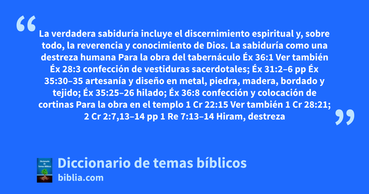 La verdadera sabiduría incluye el discernimiento espiritual y, sobre todo, la reverencia y conocimiento de Dios. La sabiduría como una destreza humana Para la obra del tabernáculo Éx 36:1 Ver también Éx 28:3 confección de vestiduras sacerdotales; Éx 31:2–6 pp Éx 35:30–35 artesanía y diseño en metal, piedra, madera, bordado y tejido; Éx 35:25–26 hilado; Éx 36:8 confección y colocación de cortinas Para la obra en el templo 1 Cr 22:15 Ver también 1 Cr 28:21; 2 Cr 2:7,13–14 pp 1 Re 7:13–14 Hiram, destreza