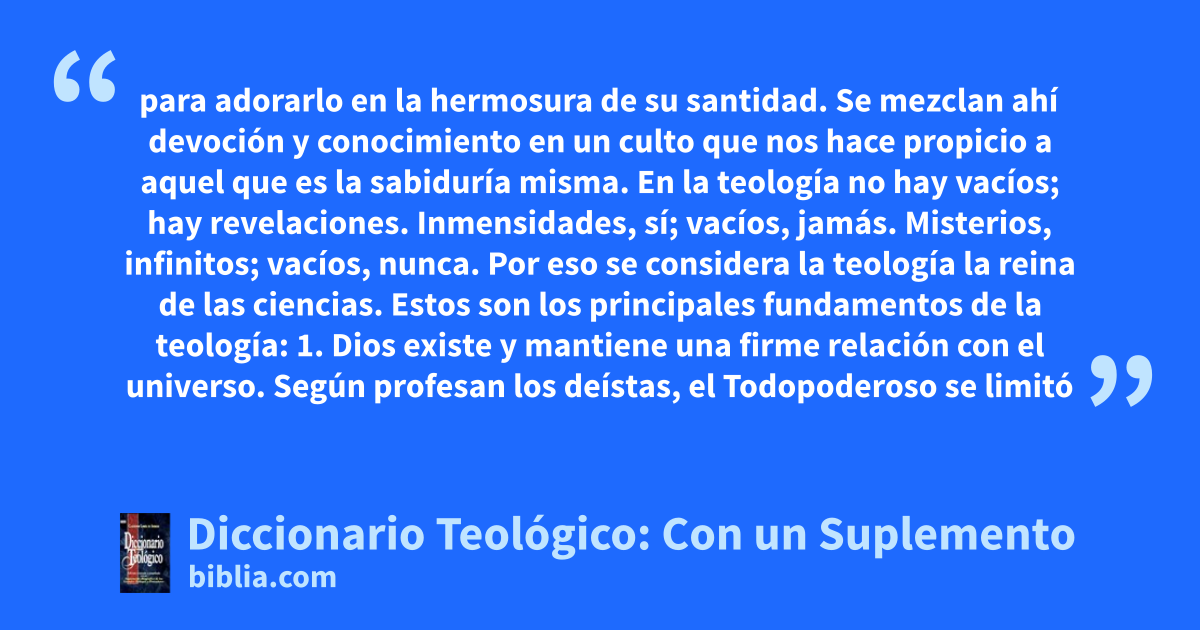 para adorarlo en la hermosura de su santidad. Se mezclan ahí devoción y conocimiento en un culto que nos hace propicio a aquel que es la sabiduría misma. En la teología no hay vacíos; hay revelaciones. Inmensidades, sí; vacíos, jamás. Misterios, infinitos; vacíos, nunca. Por eso se considera la teología la reina de las ciencias. Estos son los principales fundamentos de la teología: 1. Dios existe y mantiene una firme relación con el universo. Según profesan los deístas, el Todopoderoso se limitó