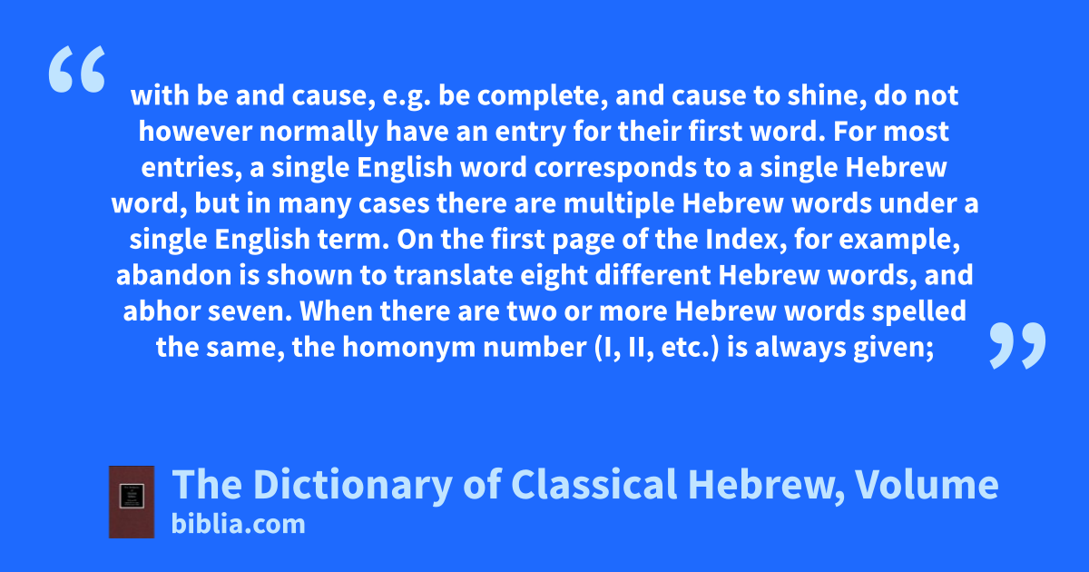 No serious study of the Hebrew text of the Bible, or indeed any other ancient Hebrew text, can properly be done without reference to DCH. Indeed, the first eight volumes would have been enough. But the English–Hebrew Index provides us with an important additional lexical tool: for example, the seven words listed for ‘truth’, eight for ‘law’, twelve for ‘save’ and the like will help us to identify...