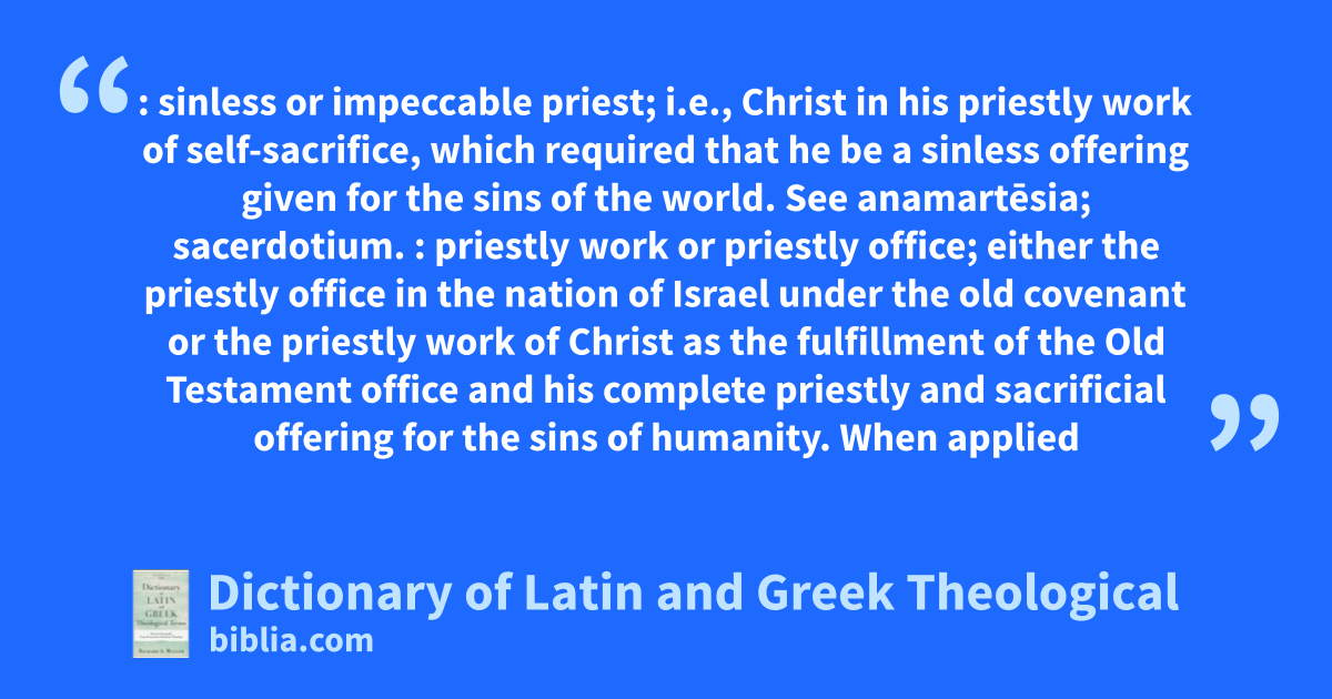 : sinless or impeccable priest; i.e., Christ in his priestly work of self-sacrifice, which required that he be a sinless offering given for the sins of the world. See anamartēsia; sacerdotium. : priestly work or priestly office; either the priestly office in the nation of Israel under the old covenant or the priestly work of Christ as the fulfillment of the Old Testament office and his complete priestly and sacrificial offering for the sins of humanity. When applied