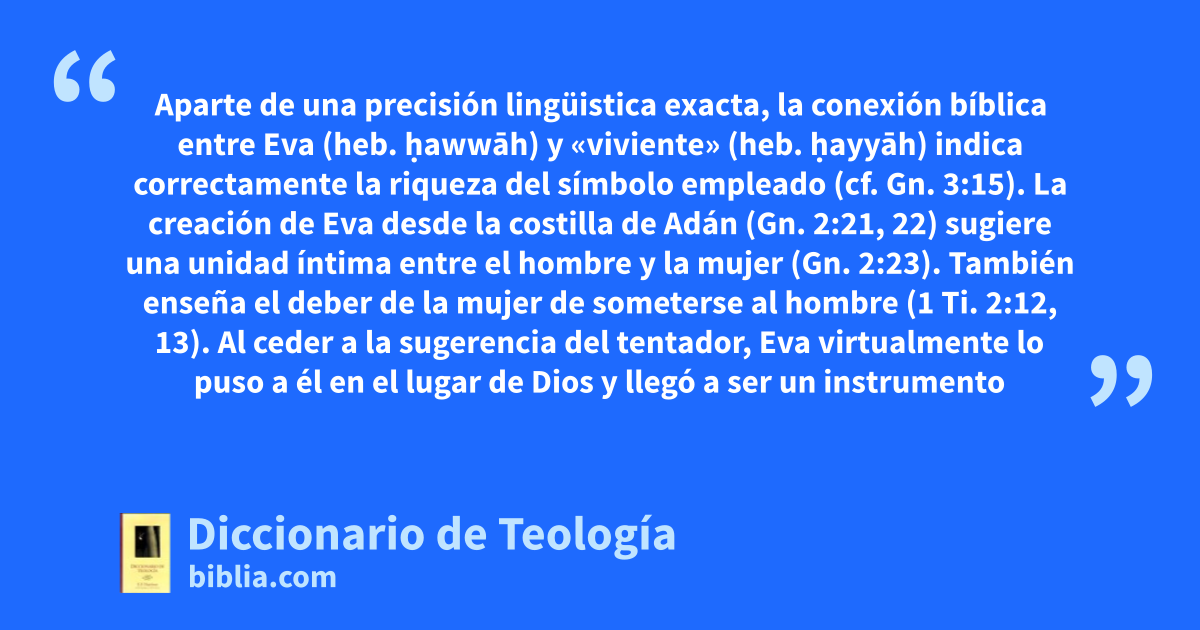 Aparte de una precisión lingüistica exacta, la conexión bíblica entre Eva (heb. ḥawwāh) y «viviente» (heb. ḥayyāh) indica correctamente la riqueza del símbolo empleado (cf. Gn. 3:15). La creación de Eva desde la costilla de Adán (Gn. 2:21, 22) sugiere una unidad íntima entre el hombre y la mujer (Gn. 2:23). También enseña el deber de la mujer de someterse al hombre (1 Ti. 2:12, 13). Al ceder a la sugerencia del tentador, Eva virtualmente lo puso a él en el lugar de Dios y llegó a ser un instrumento