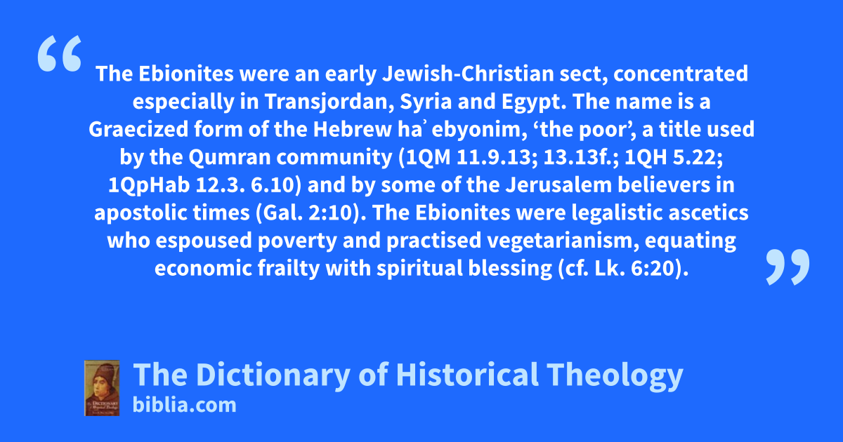 The Ebionites were an early Jewish-Christian sect, concentrated especially in Transjordan, Syria and Egypt. The name is a Graecized form of the Hebrew haʾ ebyonim, ‘the poor’, a title used by the Qumran community (1QM 11.9.13; 13.13f.; 1QH 5.22; 1QpHab 12.3. 6.10) and by some of the Jerusalem believers in apostolic times (Gal. 2:10). The Ebionites were legalistic ascetics who espoused poverty and practised vegetarianism, equating economic frailty with spiritual blessing (cf. Lk. 6:20).