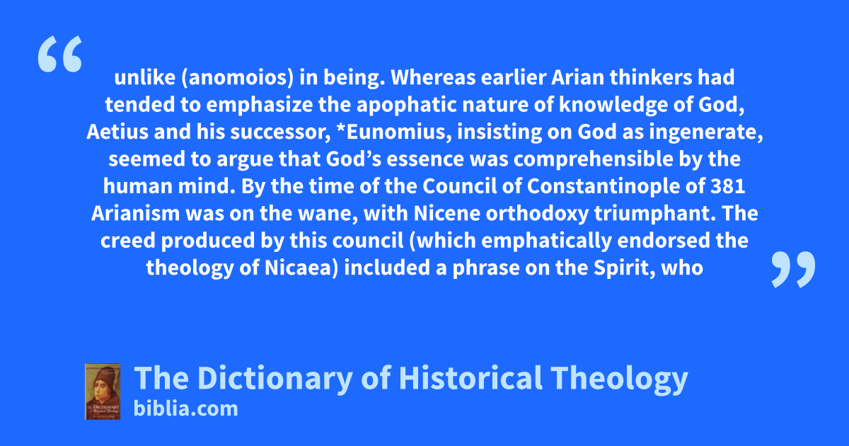 unlike (anomoios) in being. Whereas earlier Arian thinkers had tended to emphasize the apophatic nature of knowledge of God, Aetius and his successor, *Eunomius, insisting on God as ingenerate, seemed to argue that God’s essence was comprehensible by the human mind. By the time of the Council of Constantinople of 381 Arianism was on the wane, with Nicene orthodoxy triumphant. The creed produced by this council (which emphatically endorsed the theology of Nicaea) included a phrase on the Spirit, who