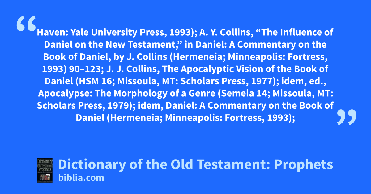 Haven: Yale University Press, 1993); A. Y. Collins, “The Influence of Daniel on the New Testament,” in Daniel: A Commentary on the Book of Daniel, by J. Collins (Hermeneia; Minneapolis: Fortress, 1993) 90–123; J. J. Collins, The Apocalyptic Vision of the Book of Daniel (HSM 16; Missoula, MT: Scholars Press, 1977); idem, ed., Apocalypse: The Morphology of a Genre (Semeia 14; Missoula, MT: Scholars Press, 1979); idem, Daniel: A Commentary on the Book of Daniel (Hermeneia; Minneapolis: Fortress, 1993);