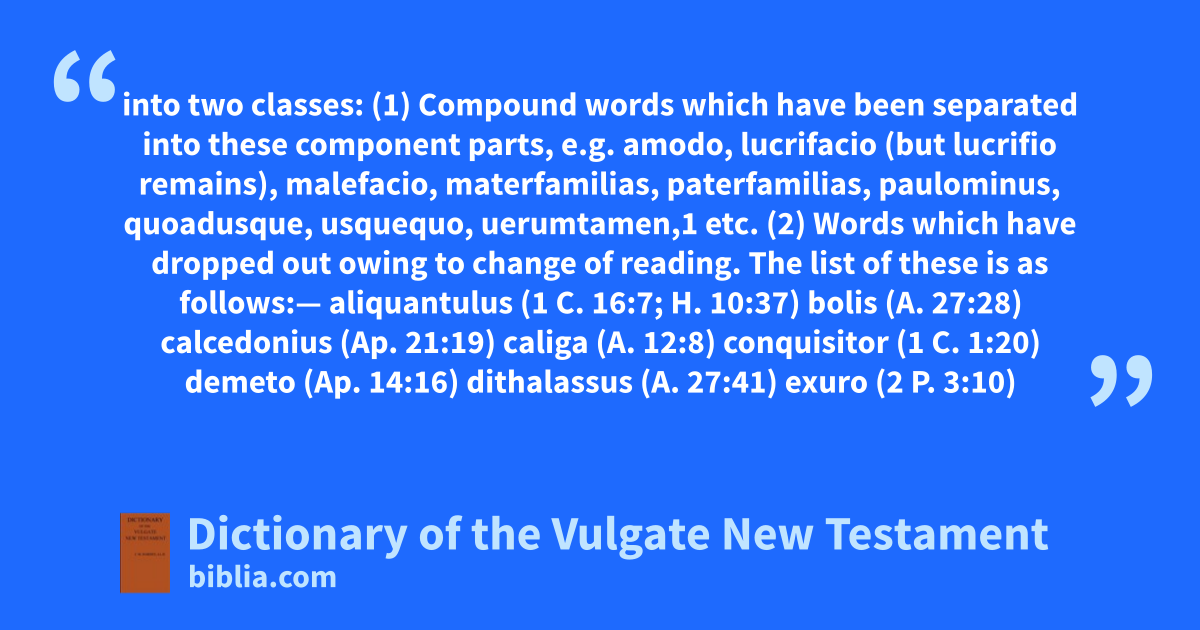 The Dictionary of the Vulgate New Testament, by J. M. Harden, provides concise glosses of all the words in the 1911 Oxford critical edition of the Vulgate New Testament, excepting those words where the meaning is plain from the English cognate (such as corruptio) and certain common words that are best covered in the grammars. In addition, introductory materials explain differences between the...