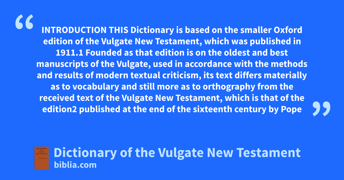 INTRODUCTION THIS Dictionary is based on the smaller Oxford edition of the Vulgate New Testament, which was published in 1911.1 Founded as that edition is on the oldest and best manuscripts of the Vulgate, used in accordance with the methods and results of modern textual criticism, its text differs materially as to vocabulary and still more as to orthography from the received text of the Vulgate New Testament, which is that of the edition2 published at the end of the sixteenth century by Pope