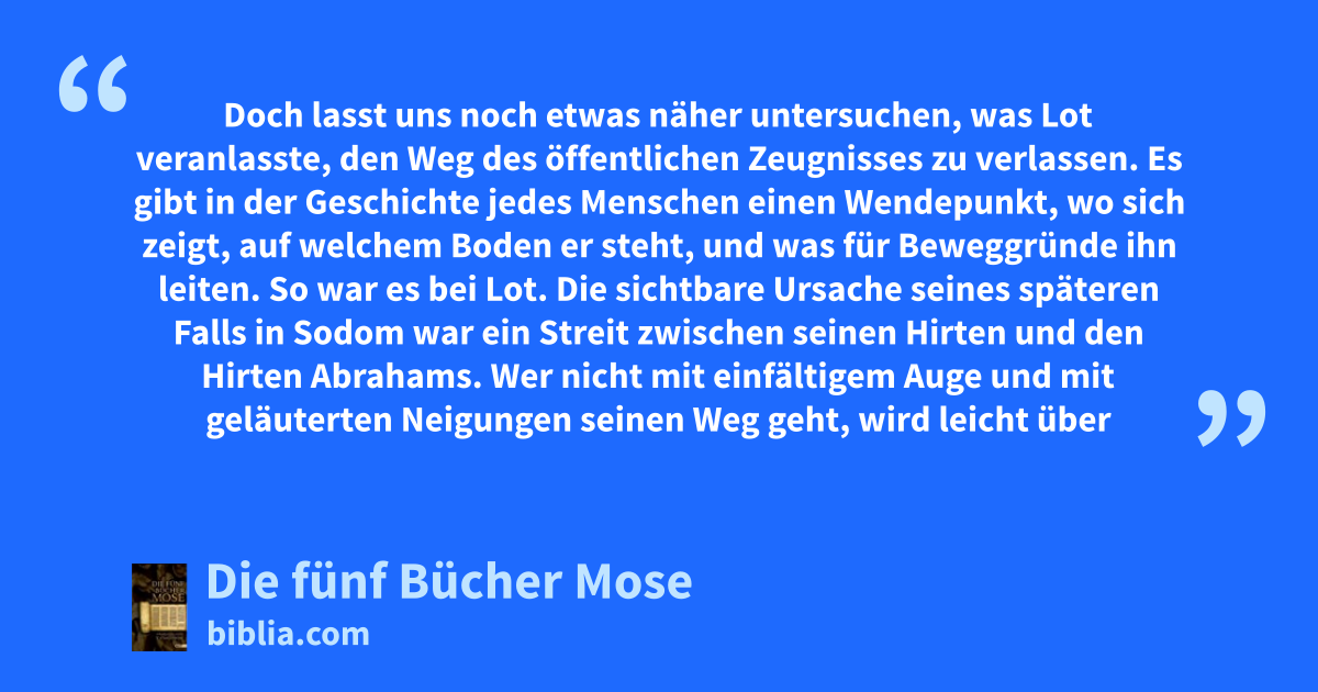 Doch lasst uns noch etwas näher untersuchen, was Lot veranlasste, den Weg des öffentlichen Zeugnisses zu verlassen. Es gibt in der Geschichte jedes Menschen einen Wendepunkt, wo sich zeigt, auf welchem Boden er steht, und was für Beweggründe ihn leiten. So war es bei Lot. Die sichtbare Ursache seines späteren Falls in Sodom war ein Streit zwischen seinen Hirten und den Hirten Abrahams. Wer nicht mit einfältigem Auge und mit geläuterten Neigungen seinen Weg geht, wird leicht über