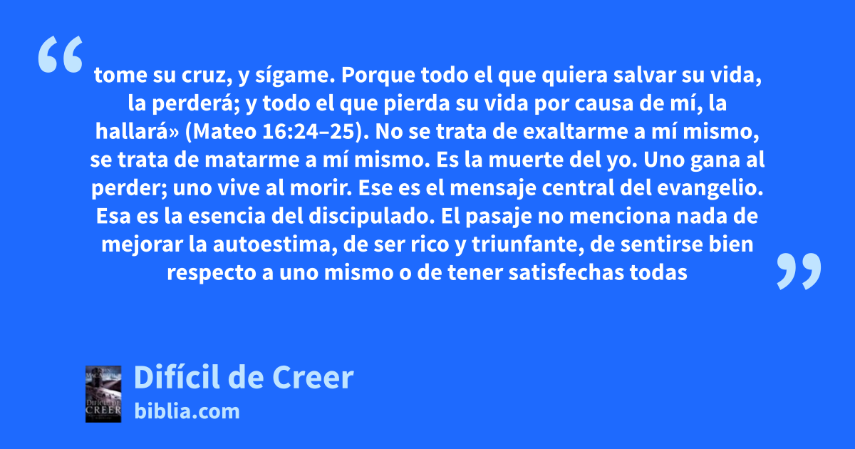 tome su cruz, y sígame. Porque todo el que quiera salvar su vida, la perderá; y todo el que pierda su vida por causa de mí, la hallará» (Mateo 16:24–25). No se trata de exaltarme a mí mismo, se trata de matarme a mí mismo. Es la muerte del yo. Uno gana al perder; uno vive al morir. Ese es el mensaje central del evangelio. Esa es la esencia del discipulado. El pasaje no menciona nada de mejorar la autoestima, de ser rico y triunfante, de sentirse bien respecto a uno mismo o de tener satisfechas todas