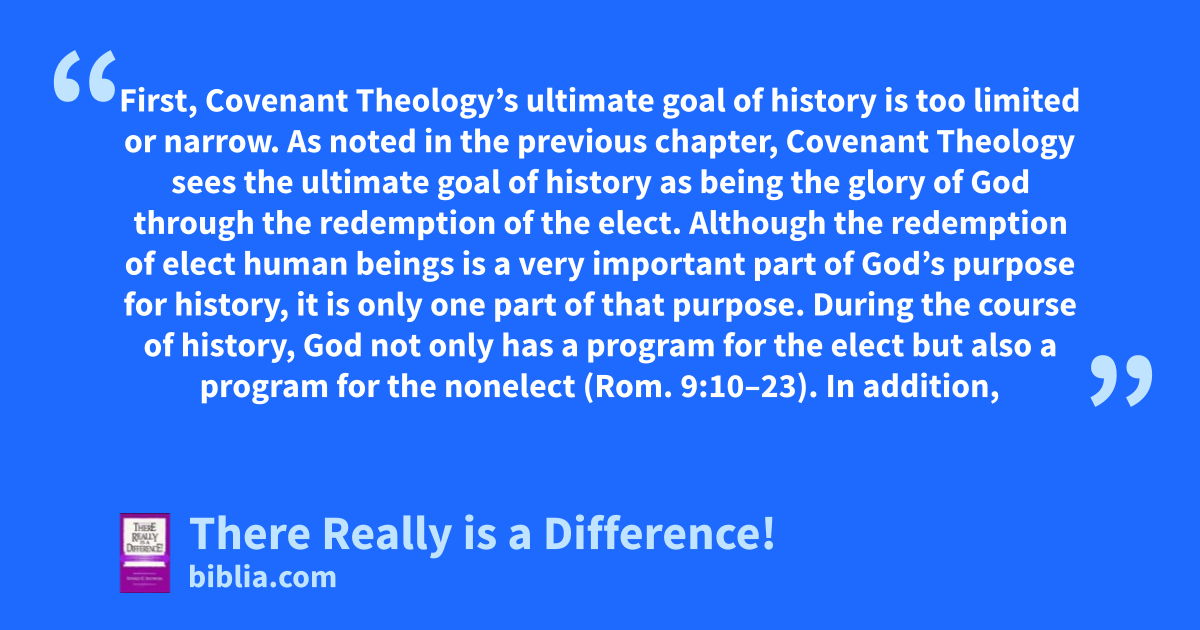 First, Covenant Theology’s ultimate goal of history is too limited or narrow. As noted in the previous chapter, Covenant Theology sees the ultimate goal of history as being the glory of God through the redemption of the elect. Although the redemption of elect human beings is a very important part of God’s purpose for history, it is only one part of that purpose. During the course of history, God not only has a program for the elect but also a program for the nonelect (Rom. 9:10–23). In addition,