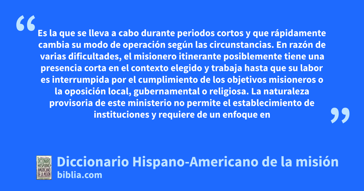Es la que se lleva a cabo durante periodos cortos y que rápidamente cambia su modo de operación según las circunstancias. En razón de varias dificultades, el misionero itinerante posiblemente tiene una presencia corta en el contexto elegido y trabaja hasta que su labor es interrumpida por el cumplimiento de los objetivos misioneros o la oposición local, gubernamental o religiosa. La naturaleza provisoria de este ministerio no permite el establecimiento de instituciones y requiere de un enfoque en