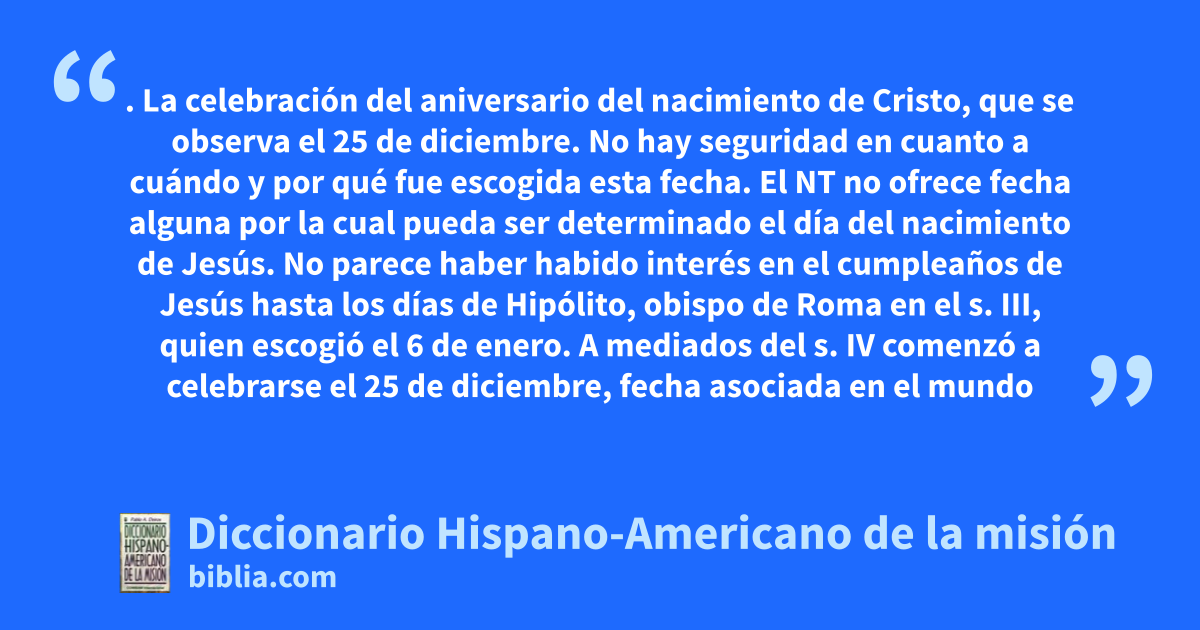 . La celebración del aniversario del nacimiento de Cristo, que se observa el 25 de diciembre. No hay seguridad en cuanto a cuándo y por qué fue escogida esta fecha. El NT no ofrece fecha alguna por la cual pueda ser determinado el día del nacimiento de Jesús. No parece haber habido interés en el cumpleaños de Jesús hasta los días de Hipólito, obispo de Roma en el s. III, quien escogió el 6 de enero. A mediados del s. IV comenzó a celebrarse el 25 de diciembre, fecha asociada en el mundo