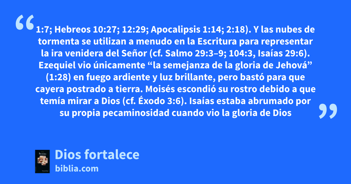 1:7; Hebreos 10:27; 12:29; Apocalipsis 1:14; 2:18). Y las nubes de tormenta se utilizan a menudo en la Escritura para representar la ira venidera del Señor (cf. Salmo 29:3–9; 104:3, Isaías 29:6). Ezequiel vio únicamente “la semejanza de la gloria de Jehová” (1:28) en fuego ardiente y luz brillante, pero bastó para que cayera postrado a tierra. Moisés escondió su rostro debido a que temía mirar a Dios (cf. Éxodo 3:6). Isaías estaba abrumado por su propia pecaminosidad cuando vio la gloria de Dios