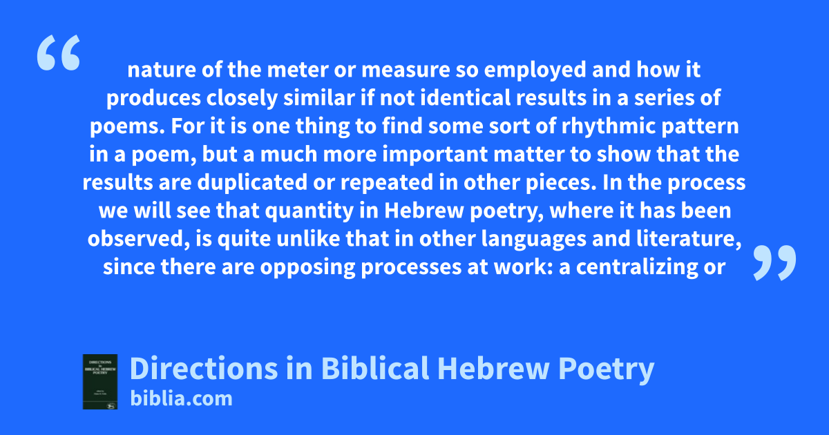 nature of the meter or measure so employed and how it produces closely similar if not identical results in a series of poems. For it is one thing to find some sort of rhythmic pattern in a poem, but a much more important matter to show that the results are duplicated or repeated in other pieces. In the process we will see that quantity in Hebrew poetry, where it has been observed, is quite unlike that in other languages and literature, since there are opposing processes at work: a centralizing or