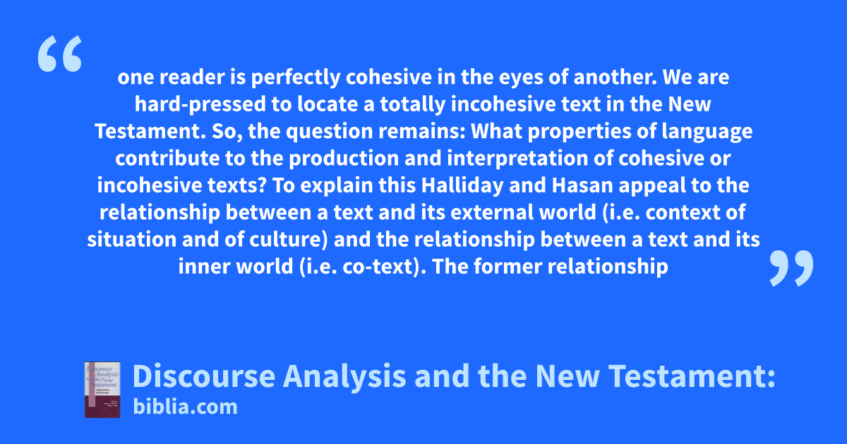 one reader is perfectly cohesive in the eyes of another. We are hard-pressed to locate a totally incohesive text in the New Testament. So, the question remains: What properties of language contribute to the production and interpretation of cohesive or incohesive texts? To explain this Halliday and Hasan appeal to the relationship between a text and its external world (i.e. context of situation and of culture) and the relationship between a text and its inner world (i.e. co-text). The former relationship