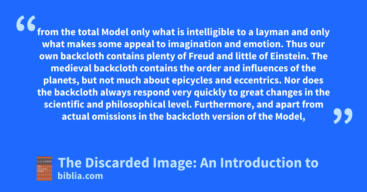 from the total Model only what is intelligible to a layman and only what makes some appeal to imagination and emotion. Thus our own backcloth contains plenty of Freud and little of Einstein. The medieval backcloth contains the order and influences of the planets, but not much about epicycles and eccentrics. Nor does the backcloth always respond very quickly to great changes in the scientific and philosophical level. Furthermore, and apart from actual omissions in the backcloth version of the Model,