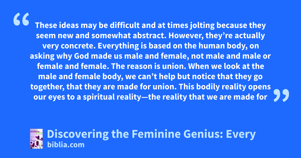 These ideas may be difficult and at times jolting because they seem new and somewhat abstract. However, they’re actually very concrete. Everything is based on the human body, on asking why God made us male and female, not male and male or female and female. The reason is union. When we look at the male and female body, we can’t help but notice that they go together, that they are made for union. This bodily reality opens our eyes to a spiritual reality—the reality that we are made for