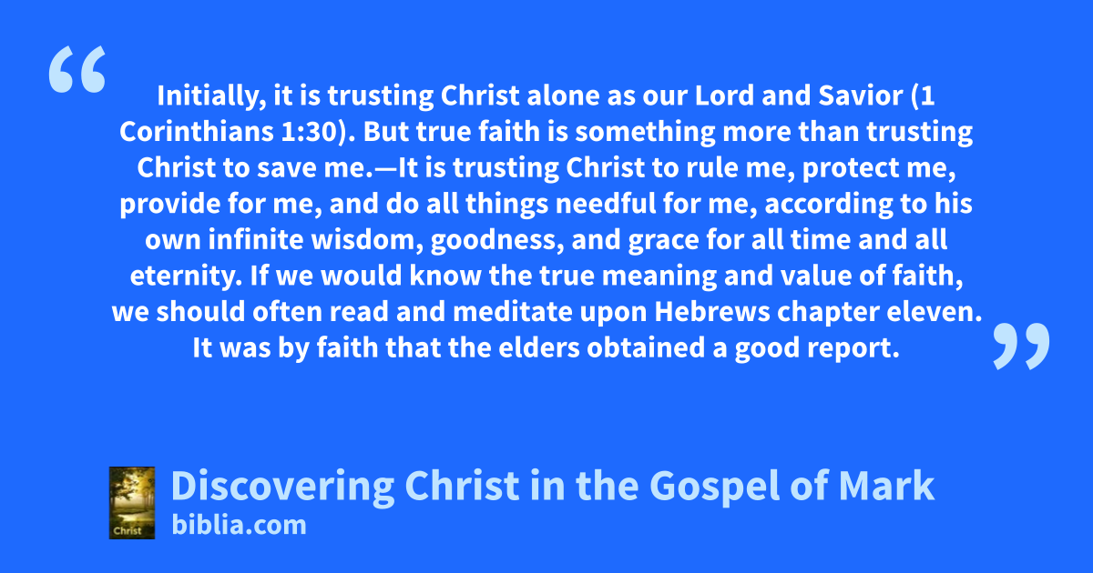 Initially, it is trusting Christ alone as our Lord and Savior (1 Corinthians 1:30). But true faith is something more than trusting Christ to save me.—It is trusting Christ to rule me, protect me, provide for me, and do all things needful for me, according to his own infinite wisdom, goodness, and grace for all time and all eternity. If we would know the true meaning and value of faith, we should often read and meditate upon Hebrews chapter eleven. It was by faith that the elders obtained a good report.