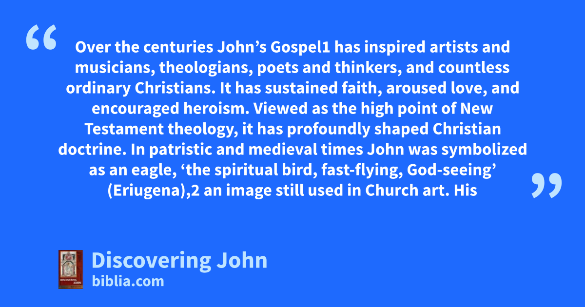 Over the centuries John’s Gospel1 has inspired artists and musicians, theologians, poets and thinkers, and countless ordinary Christians. It has sustained faith, aroused love, and encouraged heroism. Viewed as the high point of New Testament theology, it has profoundly shaped Christian doctrine. In patristic and medieval times John was symbolized as an eagle, ‘the spiritual bird, fast-flying, God-seeing’ (Eriugena),2 an image still used in Church art. His