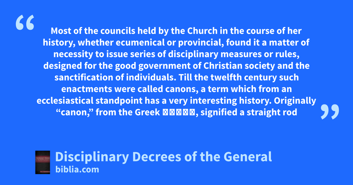 Most of the councils held by the Church in the course of her history, whether ecumenical or provincial, found it a matter of necessity to issue series of disciplinary measures or rules, designed for the good government of Christian society and the sanctification of individuals. Till the twelfth century such enactments were called canons, a term which from an ecclesiastical standpoint has a very interesting history. Originally “canon,” from the Greek κανών, signified a straight rod