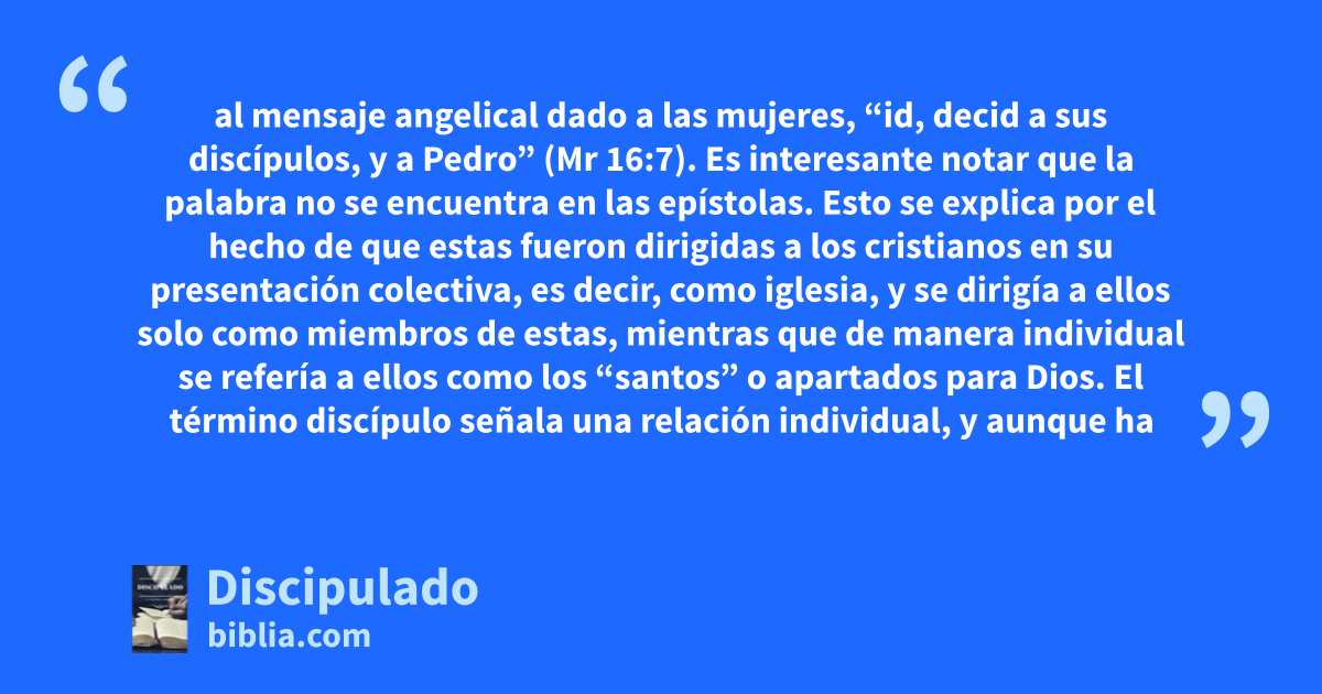 al mensaje angelical dado a las mujeres, “id, decid a sus discípulos, y a Pedro” (Mr 16:7). Es interesante notar que la palabra no se encuentra en las epístolas. Esto se explica por el hecho de que estas fueron dirigidas a los cristianos en su presentación colectiva, es decir, como iglesia, y se dirigía a ellos solo como miembros de estas, mientras que de manera individual se refería a ellos como los “santos” o apartados para Dios. El término discípulo señala una relación individual, y aunque ha