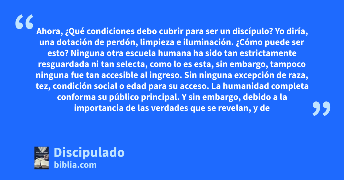 Ahora, ¿Qué condiciones debo cubrir para ser un discípulo? Yo diría, una dotación de perdón, limpieza e iluminación. ¿Cómo puede ser esto? Ninguna otra escuela humana ha sido tan estrictamente resguardada ni tan selecta, como lo es esta, sin embargo, tampoco ninguna fue tan accesible al ingreso. Sin ninguna excepción de raza, tez, condición social o edad para su acceso. La humanidad completa conforma su público principal. Y sin embargo, debido a la importancia de las verdades que se revelan, y de