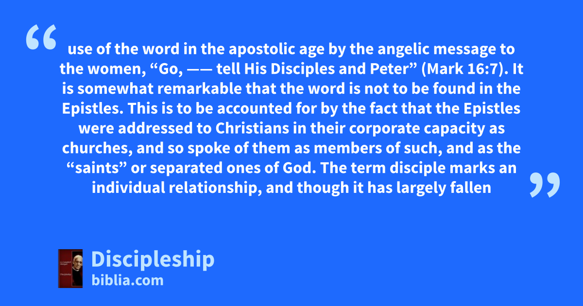 use of the word in the apostolic age by the angelic message to the women, “Go, —— tell His Disciples and Peter” (Mark 16:7). It is somewhat remarkable that the word is not to be found in the Epistles. This is to be accounted for by the fact that the Epistles were addressed to Christians in their corporate capacity as churches, and so spoke of them as members of such, and as the “saints” or separated ones of God. The term disciple marks an individual relationship, and though it has largely fallen
