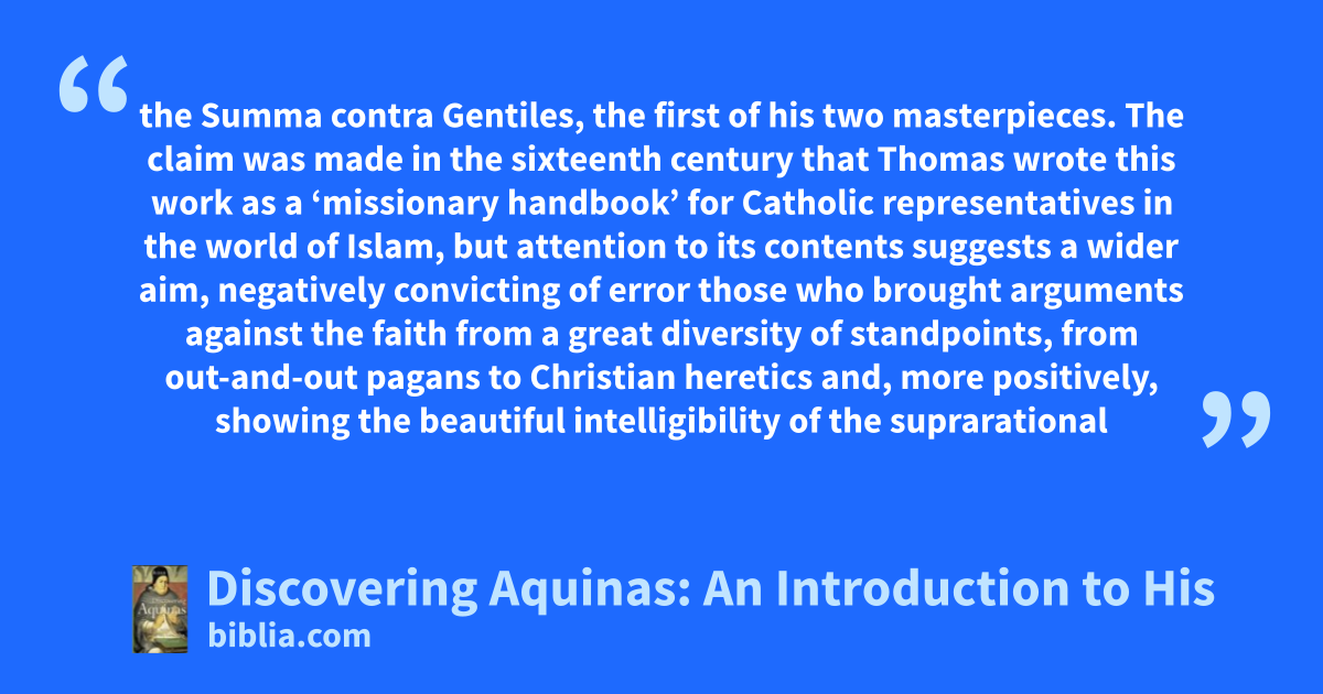 the Summa contra Gentiles, the first of his two masterpieces. The claim was made in the sixteenth century that Thomas wrote this work as a ‘missionary handbook’ for Catholic representatives in the world of Islam, but attention to its contents suggests a wider aim, negatively convicting of error those who brought arguments against the faith from a great diversity of standpoints, from out-and-out pagans to Christian heretics and, more positively, showing the beautiful intelligibility of the suprarational