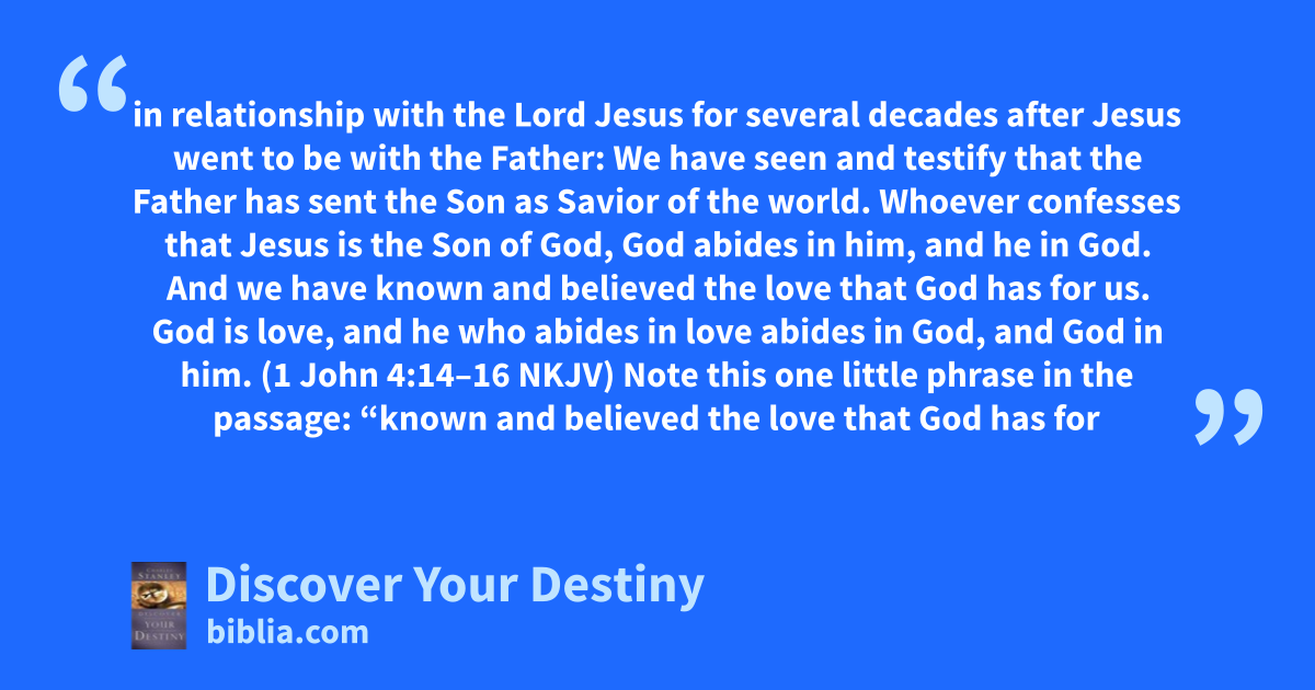 in relationship with the Lord Jesus for several decades after Jesus went to be with the Father: We have seen and testify that the Father has sent the Son as Savior of the world. Whoever confesses that Jesus is the Son of God, God abides in him, and he in God. And we have known and believed the love that God has for us. God is love, and he who abides in love abides in God, and God in him. (1 John 4:14–16 NKJV) Note this one little phrase in the passage: “known and believed the love that God has for