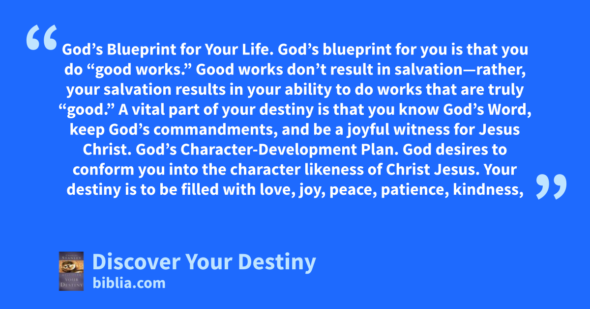 God’s Blueprint for Your Life. God’s blueprint for you is that you do “good works.” Good works don’t result in salvation—rather, your salvation results in your ability to do works that are truly “good.” A vital part of your destiny is that you know God’s Word, keep God’s commandments, and be a joyful witness for Jesus Christ. God’s Character-Development Plan. God desires to conform you into the character likeness of Christ Jesus. Your destiny is to be filled with love, joy, peace, patience, kindness,