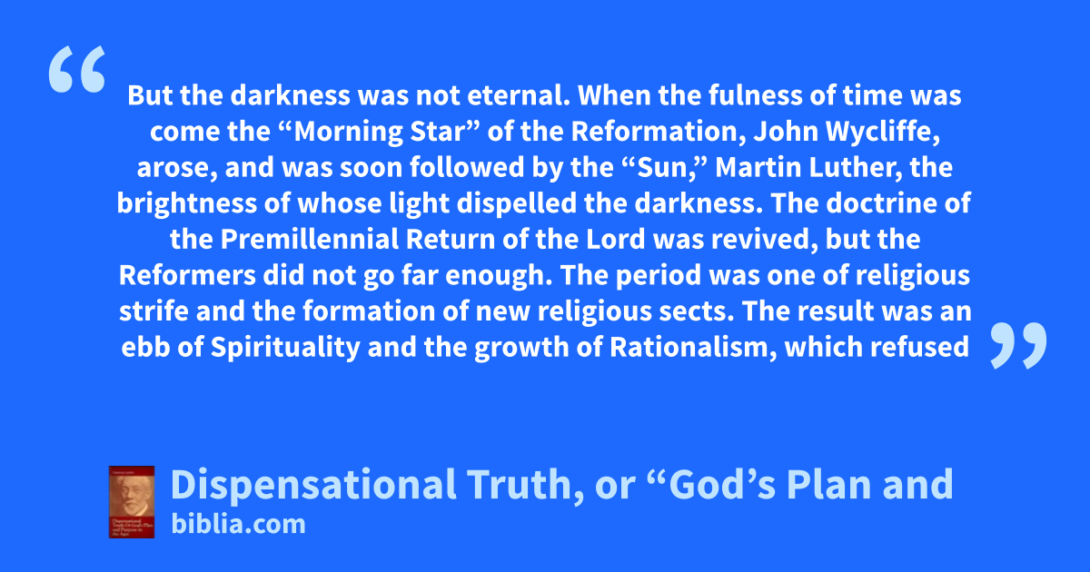 But the darkness was not eternal. When the fulness of time was come the “Morning Star” of the Reformation, John Wycliffe, arose, and was soon followed by the “Sun,” Martin Luther, the brightness of whose light dispelled the darkness. The doctrine of the Premillennial Return of the Lord was revived, but the Reformers did not go far enough. The period was one of religious strife and the formation of new religious sects. The result was an ebb of Spirituality and the growth of Rationalism, which refused