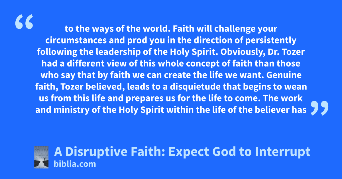 to the ways of the world. Faith will challenge your circumstances and prod you in the direction of persistently following the leadership of the Holy Spirit. Obviously, Dr. Tozer had a different view of this whole concept of faith than those who say that by faith we can create the life we want. Genuine faith, Tozer believed, leads to a disquietude that begins to wean us from this life and prepares us for the life to come. The work and ministry of the Holy Spirit within the life of the believer has