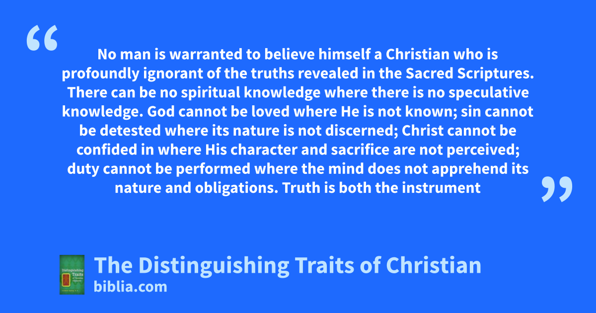 No man is warranted to believe himself a Christian who is profoundly ignorant of the truths revealed in the Sacred Scriptures. There can be no spiritual knowledge where there is no speculative knowledge. God cannot be loved where He is not known; sin cannot be detested where its nature is not discerned; Christ cannot be confided in where His character and sacrifice are not perceived; duty cannot be performed where the mind does not apprehend its nature and obligations. Truth is both the instrument
