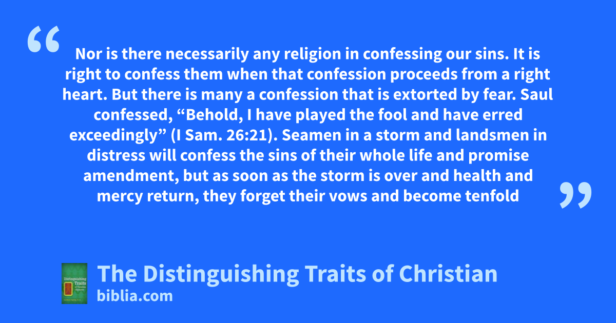 Nor is there necessarily any religion in confessing our sins. It is right to confess them when that confession proceeds from a right heart. But there is many a confession that is extorted by fear. Saul confessed, “Behold, I have played the fool and have erred exceedingly” (I Sam. 26:21). Seamen in a storm and landsmen in distress will confess the sins of their whole life and promise amendment, but as soon as the storm is over and health and mercy return, they forget their vows and become tenfold