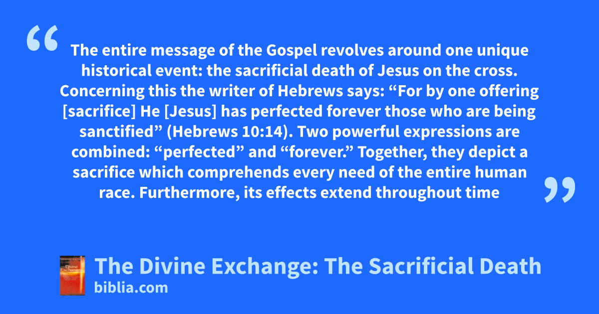 The entire message of the Gospel revolves around one unique historical event: the sacrificial death of Jesus on the cross. Concerning this the writer of Hebrews says: “For by one offering [sacrifice] He [Jesus] has perfected forever those who are being sanctified” (Hebrews 10:14). Two powerful expressions are combined: “perfected” and “forever.” Together, they depict a sacrifice which comprehends every need of the entire human race. Furthermore, its effects extend throughout time