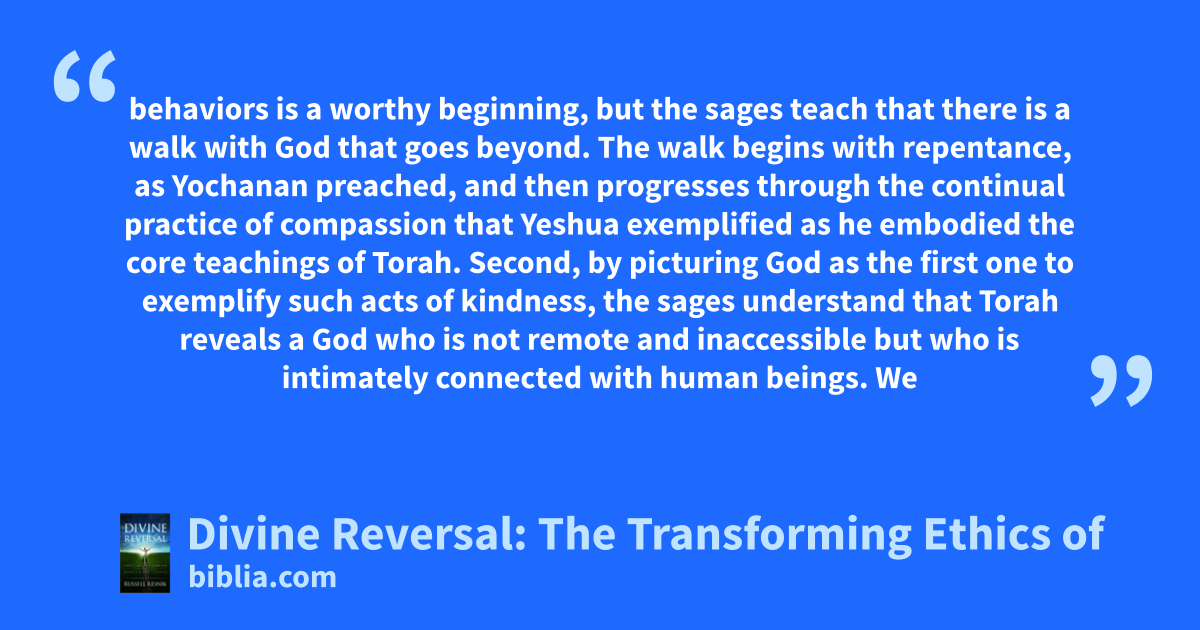 behaviors is a worthy beginning, but the sages teach that there is a walk with God that goes beyond. The walk begins with repentance, as Yochanan preached, and then progresses through the continual practice of compassion that Yeshua exemplified as he embodied the core teachings of Torah. Second, by picturing God as the first one to exemplify such acts of kindness, the sages understand that Torah reveals a God who is not remote and inaccessible but who is intimately connected with human beings. We
