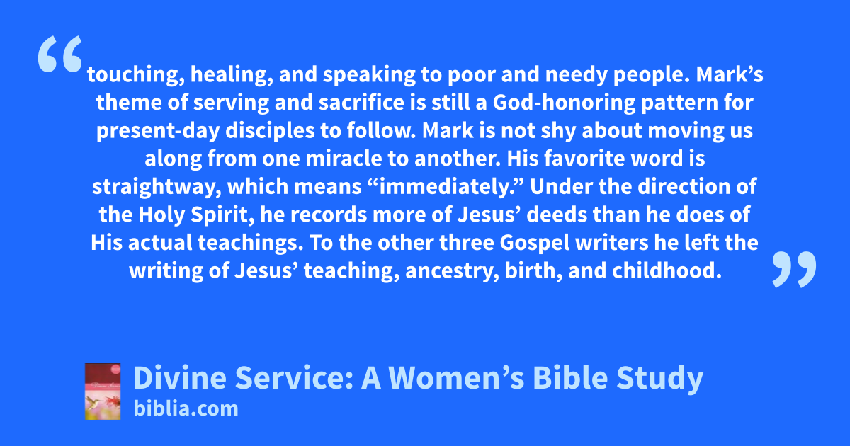 touching, healing, and speaking to poor and needy people. Mark’s theme of serving and sacrifice is still a God-honoring pattern for present-day disciples to follow. Mark is not shy about moving us along from one miracle to another. His favorite word is straightway, which means “immediately.” Under the direction of the Holy Spirit, he records more of Jesus’ deeds than he does of His actual teachings. To the other three Gospel writers he left the writing of Jesus’ teaching, ancestry, birth, and childhood.
