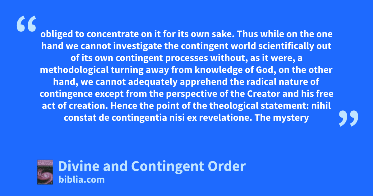 obliged to concentrate on it for its own sake. Thus while on the one hand we cannot investigate the contingent world scientifically out of its own contingent processes without, as it were, a methodological turning away from knowledge of God, on the other hand, we cannot adequately apprehend the radical nature of contingence except from the perspective of the Creator and his free act of creation. Hence the point of the theological statement: nihil constat de contingentia nisi ex revelatione. The mystery