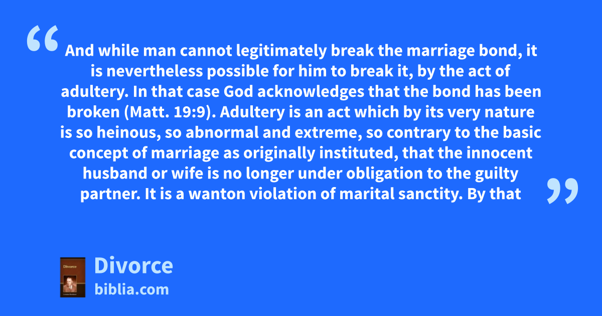 And while man cannot legitimately break the marriage bond, it is nevertheless possible for him to break it, by the act of adultery. In that case God acknowledges that the bond has been broken (Matt. 19:9). Adultery is an act which by its very nature is so heinous, so abnormal and extreme, so contrary to the basic concept of marriage as originally instituted, that the innocent husband or wife is no longer under obligation to the guilty partner. It is a wanton violation of marital sanctity. By that