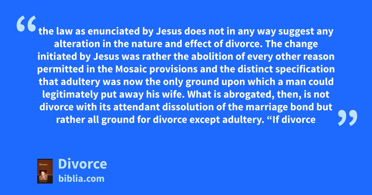 the law as enunciated by Jesus does not in any way suggest any alteration in the nature and effect of divorce. The change initiated by Jesus was rather the abolition of every other reason permitted in the Mosaic provisions and the distinct specification that adultery was now the only ground upon which a man could legitimately put away his wife. What is abrogated, then, is not divorce with its attendant dissolution of the marriage bond but rather all ground for divorce except adultery. “If divorce