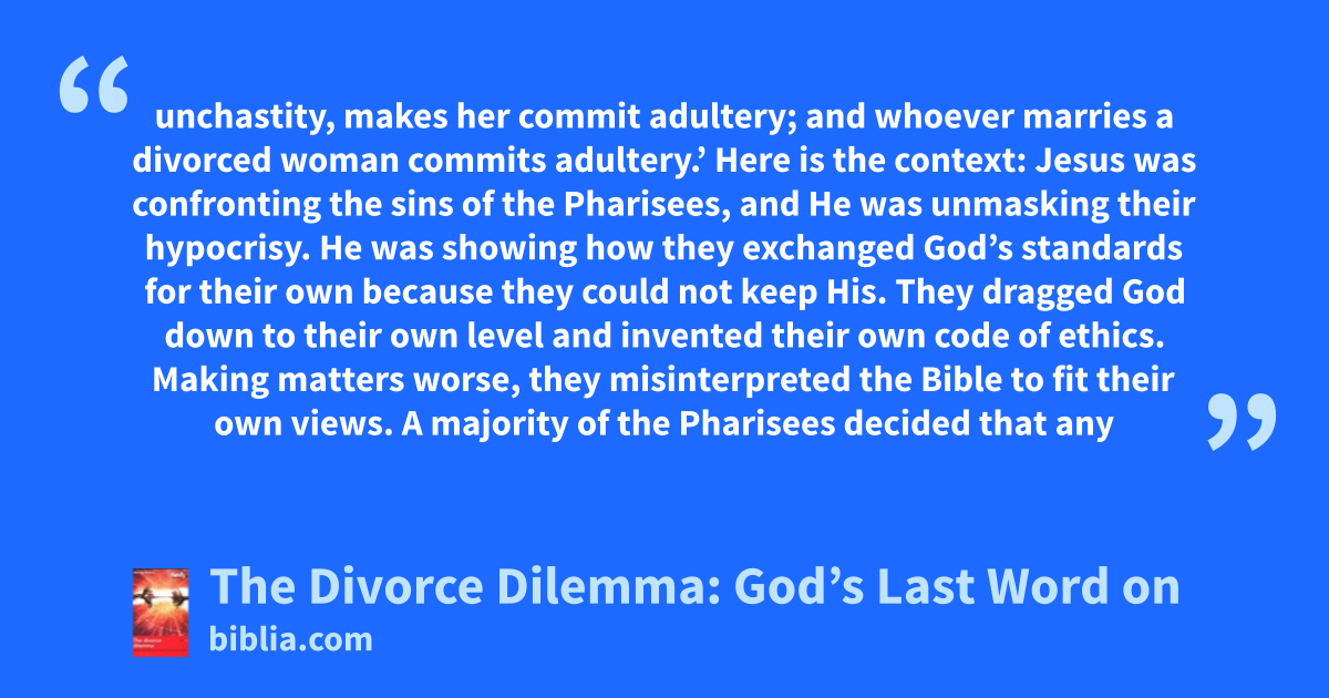unchastity, makes her commit adultery; and whoever marries a divorced woman commits adultery.’ Here is the context: Jesus was confronting the sins of the Pharisees, and He was unmasking their hypocrisy. He was showing how they exchanged God’s standards for their own because they could not keep His. They dragged God down to their own level and invented their own code of ethics. Making matters worse, they misinterpreted the Bible to fit their own views. A majority of the Pharisees decided that any